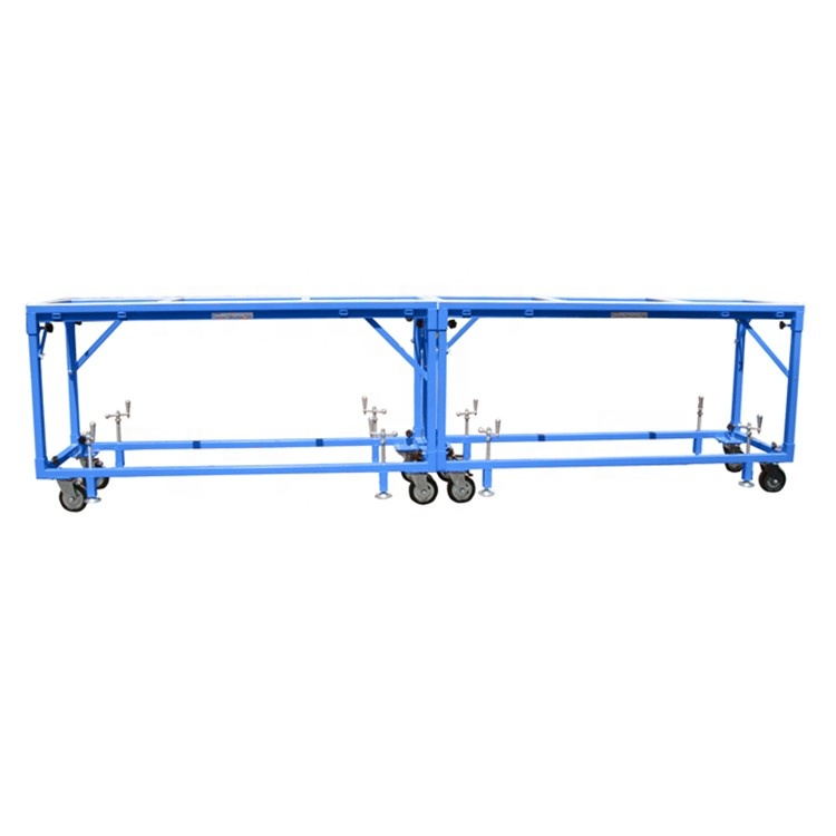 Versatile fabrication table with connecting screws allowing the unit to be jointed to other tables to create customized work configurations.